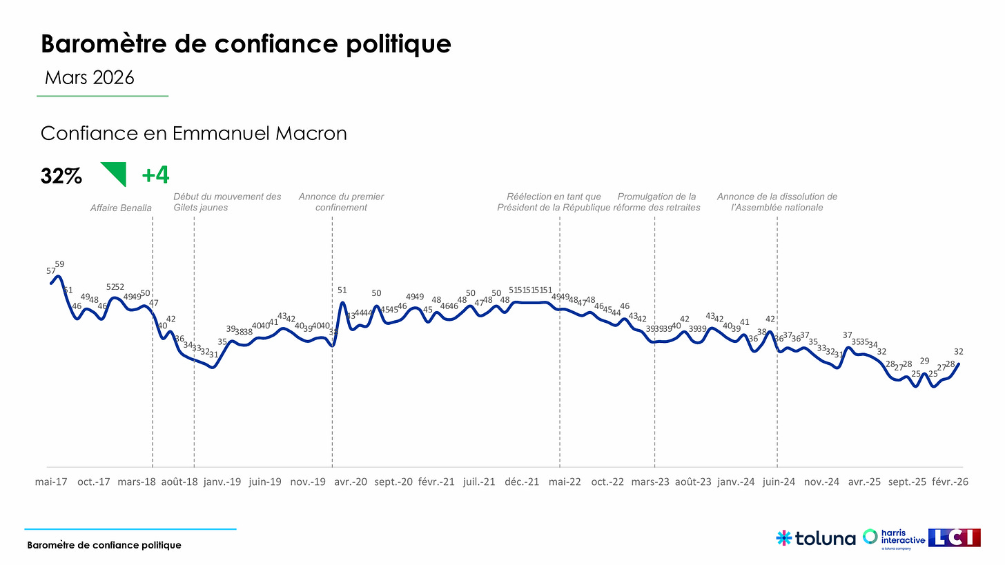 Sticking with polling for now, it turns out that public confidence in Emmanuel Macron has grown due to how he has positioned himself and represented the French people during a time of geopolitical turbulence.
