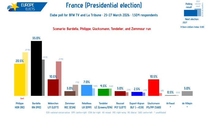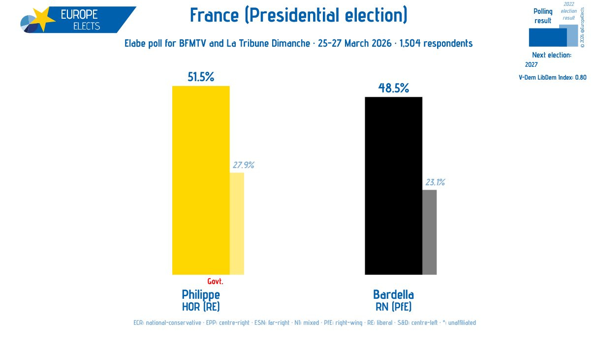 Second round, Philippe vs Bardella: So, taking these in mind, Edouard Philippe would currently win a hypothetical run-off against Bardella, but only at 51.5% to 48.5%. The Republican Front holds, but its margin is historically narrow and would show a sharp fall from the victory margin when Macron beat Le Pen by over 17% in 2022.