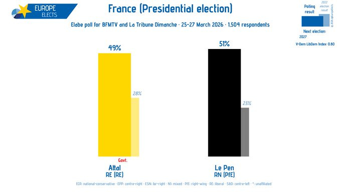 Second round, Attal vs Le Pen: The most striking result in the poll. Le Pen beats Attal 51% to 49% in a hypothetical run-off. In this scenario, the Republican Front effectively collapses, with Attal losing some portion of the non-centrist electorate from either the left, the right, or both.