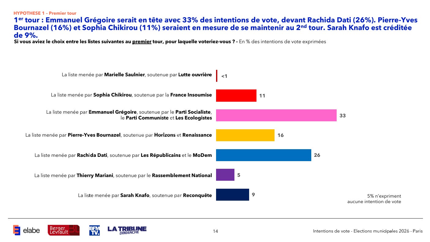 Currently, Rachida Dati (26% - LR) is in second place behind Emmanuel Grégoire (33% - PS), who leads the pack by a wide margin. Behind them sit Pierre-Yves Bournazel (16% - REN) and Sophia Chikirou (11% - LFI) who currently look like they have a good chance of winning over 10% of the votes and making it into the second round of the municipal elections.