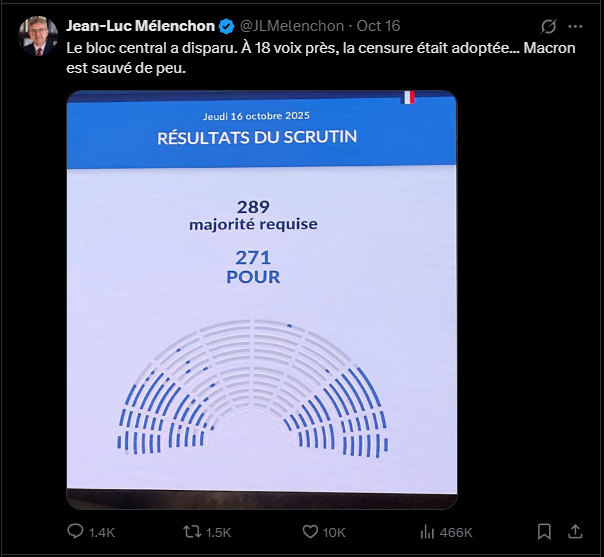 Now, this motion of censure was the nuclear bomb that was the most likely to take the nascent Lecornu II government down, and with 271 votes in favour, the vote failed by only 18 votes.