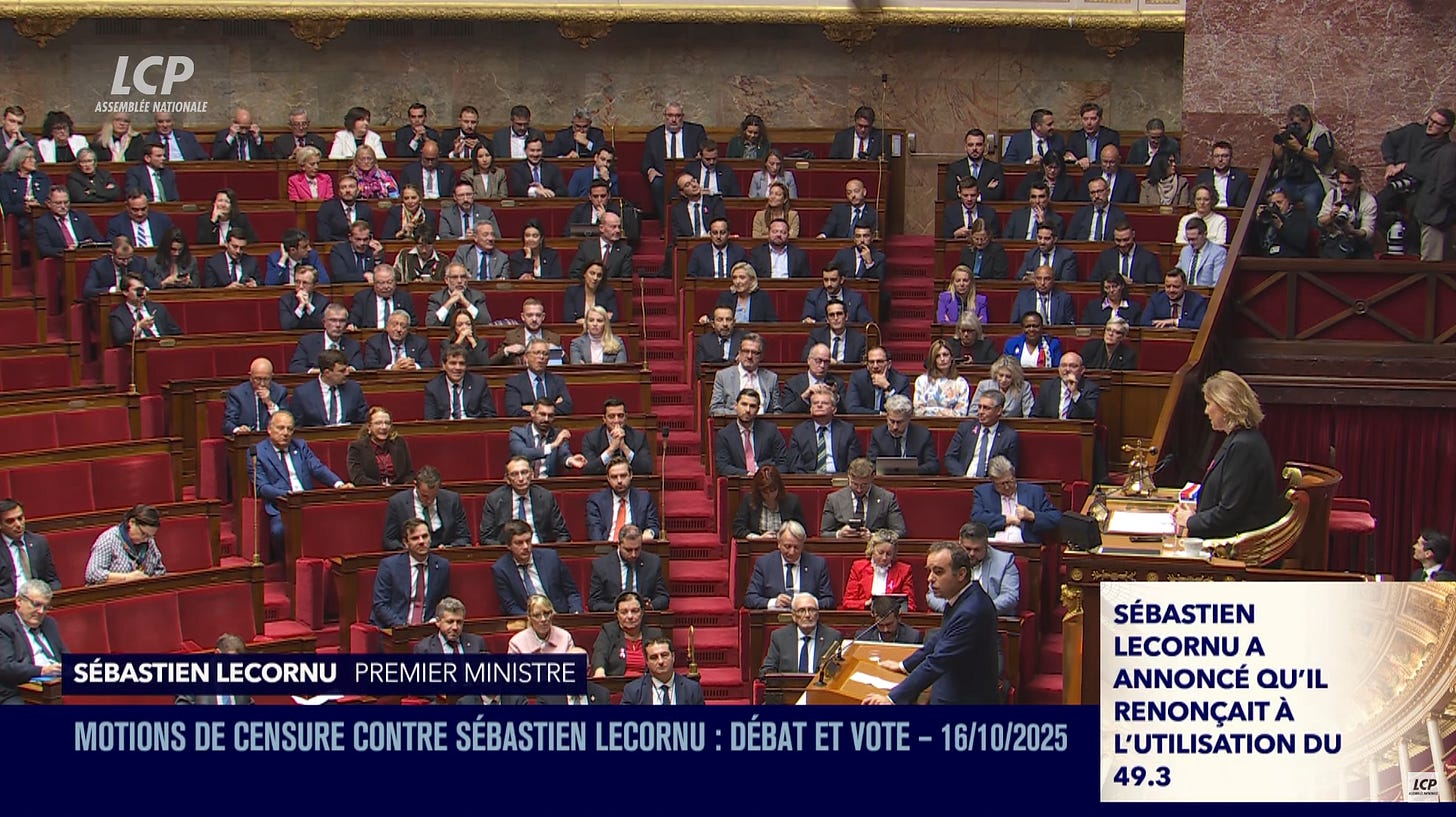 So, ladies and gentlemen, the big story of the week: Sébastien Lecornu’s second government has beaten the 836-minute record of his first, survived two motions of censure, and it’s looking like his government may be able to finally get to work.